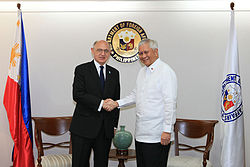 Albert Ferreros del Rosario (born November 14 1939) is the current Secretary of Foreign Affairs of the Philippines. On February 24 2011 President Benigno Aquino III swore in del Rosario as his Secretary of Foreign Affairs replacing Alberto Romulo.
