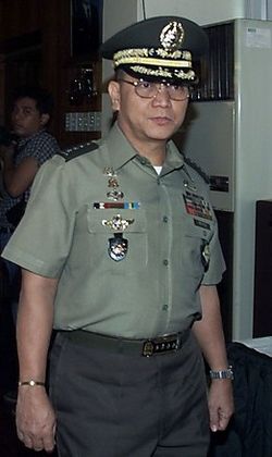 Angelo Tomás Reyes (March 17 1945 - February 8 2011) was the Armed Forces of the Philippines (AFP) Chief of Staff from 2000 to 2001 under President Joseph Estrada. At the height of the 2001 EDSA Revolution Reyes withdrew his support for Estrada which led to the installation of Vice President Gloria Macapagal-Arroyo as president under whom he then served as cabinet secretary until to 2010 including with the portfolios of National Defense and Energy.