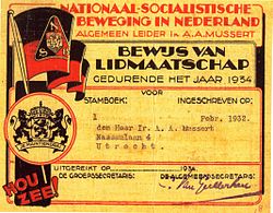 Anton Adriaan Mussert (May 11 1894 Werkendam North Brabant - May 7 1946) was one of the founders of the National Socialist Movement (NSB) in the Netherlands and its de jure leader. As such he was the most prominent national socialist in the Netherlands before and during World War II. During the war he was able to keep this position due to the support he received from the Germans. After the war he was convicted and executed for high treason.