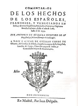 Antonio de Herrera y Tordesillas was a chronicler historian and writer of the Spanish Golden Age author of Historia general de los hechos de los castellanos en las Islas y Tierra Firme del mar Océano que llaman Indias Occidentales (General History of the Deeds of the Castilians on the Islands and Mainland of the Ocean Sea Known As the West Indies) better known in Spanish as Décadas and considered one of the best works written on the conquest of the Americas.