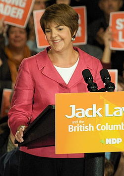 Carole Alison James MLA (born December 22 1957) is a Canadian politician and former public administrator. She is the former Leader of the Opposition in British Columbia and former leader of the British Columbia New Democratic Party (NDP) a social democratic political party. She announced her intention to resign as leader on December 6 2010 and was officially replaced by interim leader Dawn Black on January 20 2011.
