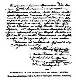John Carroll (January 8 1735 - December 3 1815) was the first Roman Catholic bishop and archbishop in the United States - serving as the ordinary of the Archdiocese of Baltimore. He is also known as the founder of Georgetown University the oldest Catholic university in the United States and St. John the Evangelist Parish of Rock Creek the first secular (diocesan) parish in the country.